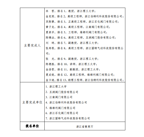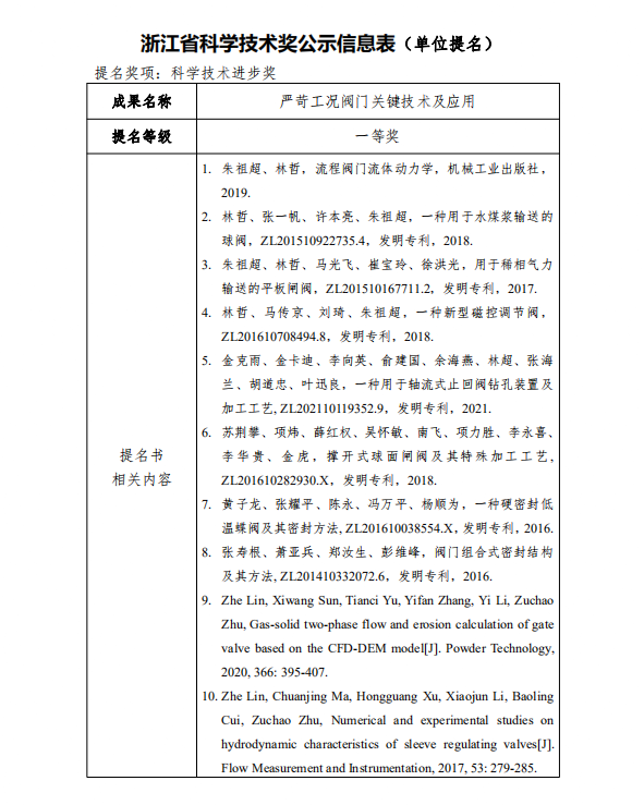 根據(jù)《浙江省科學(xué)技術(shù)廳關(guān)于開展2021年度浙江省科學(xué)技術(shù)獎(jiǎng)提名工作的通知》要求,現(xiàn)對(duì)我單位擬參與申報(bào)的浙江省科技獎(jiǎng)勵(lì)項(xiàng)目“嚴(yán)苛工況閥門關(guān)鍵技術(shù)及應(yīng)用”予以公示,公示期7天(2022年2月26日至2022年3月4日)。